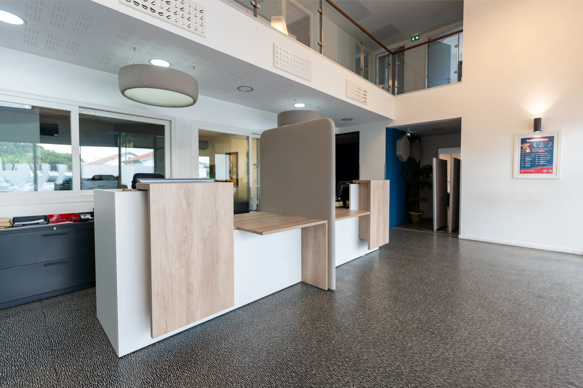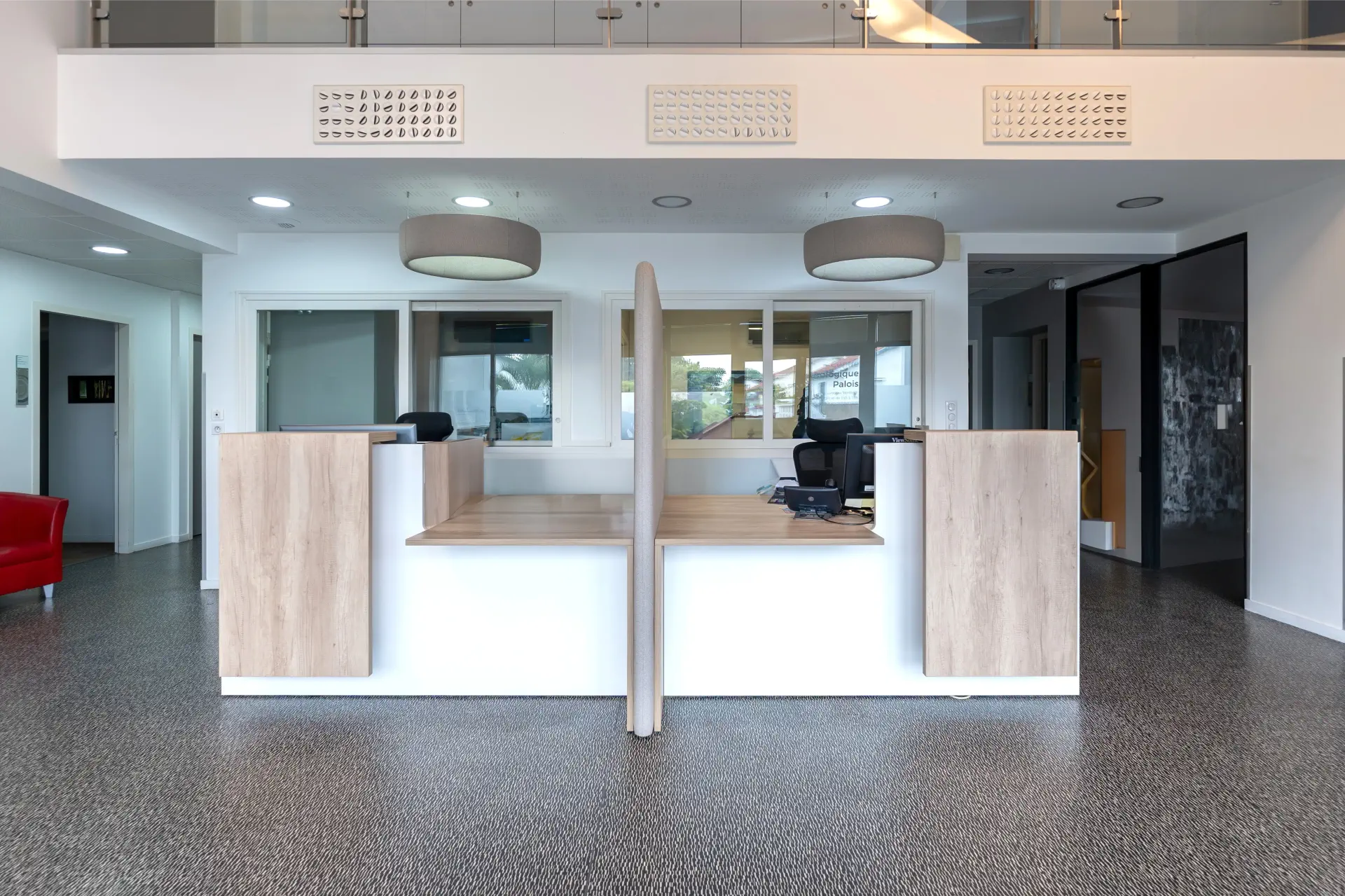 La banque d’accueil a été redessinée comme un élément structurant : accessible PMR, segmentée pour préserver la confidentialité, et intégrant des dispositifs acoustiques performants sans rompre la fluidité visuelle.