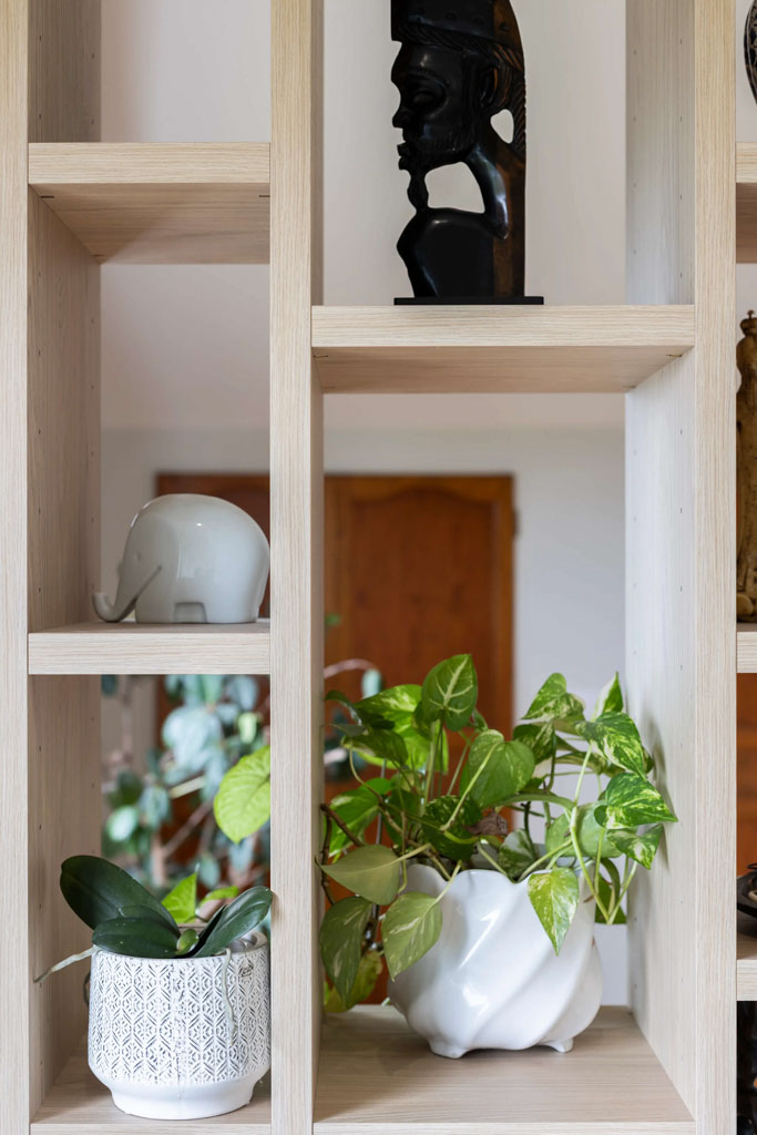 Plusieurs axes structurants ont guidé la réflexion : recréer un dialogue harmonieux entre le salon et la salle à manger organisés sur deux niveaux, intégrer les objets d’art africains de la cliente comme de véritables éléments de composition, repenser une cuisine devenue peu fonctionnelle pour en faire un espace contemporain et convivial, retravailler la circulation depuis l’entrée cathédrale afin d’affirmer dès le seuil l’univers souhaité, et apaiser la chambre parentale en double hauteur en y intégrant un espace bureau sans rupture d’ambiance.