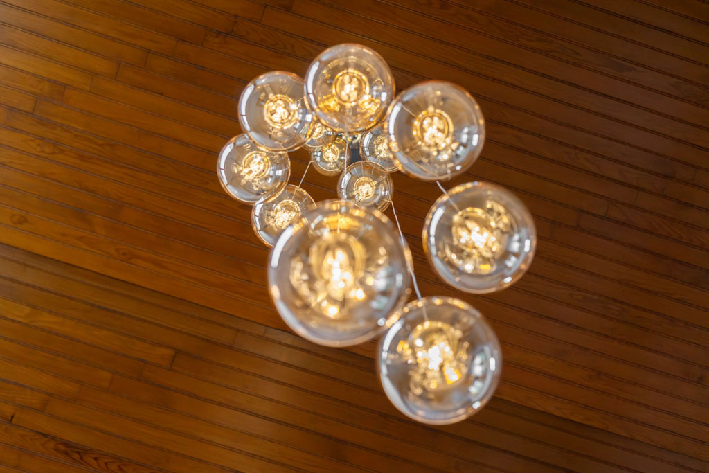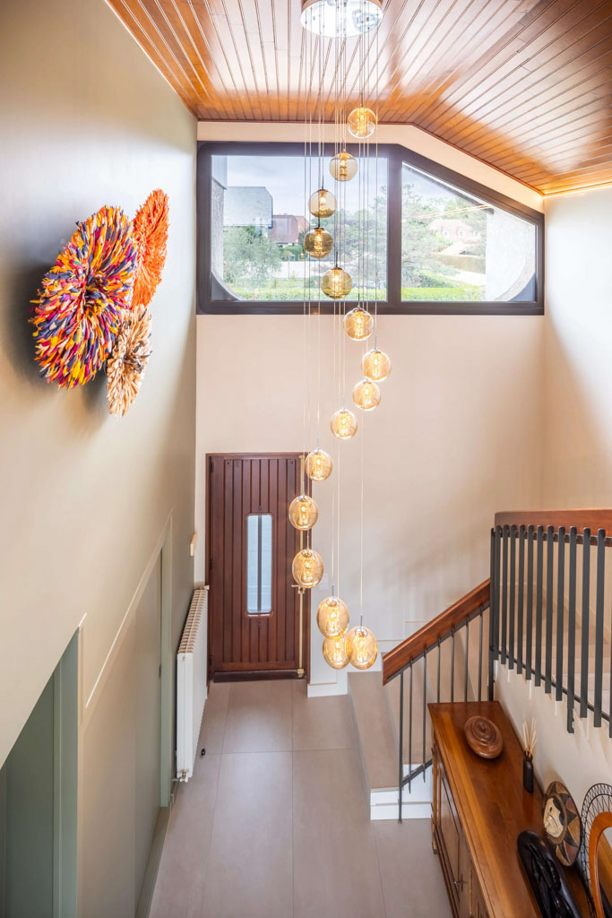 La lumière naturelle, omniprésente, a été le point de départ du projet. Le parti pris a été de la laisser circuler librement, d’accompagner les volumes et de révéler les hauteurs, notamment dès l’entrée où le regard est immédiatement attiré par le plafond en lambris bois et la verticalité des espaces.