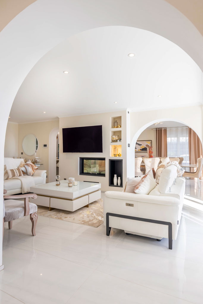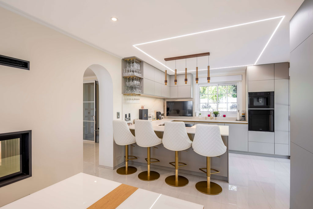 Le projet a porté sur une rénovation totale de la maison, avec une reconfiguration complète des espaces intérieurs. L’enjeu était double : conserver l’identité architecturale existante (arches, vitraux, lumière naturelle abondante), tout en insufflant une écriture contemporaine, élégante et cohérente, inspirée des univers internationaux chers à la cliente.