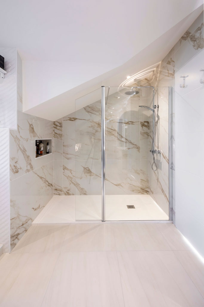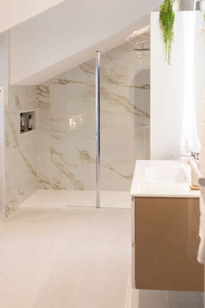 Les matériaux ont été sélectionnés pour apporter chaleur et profondeur : marbres aux veinages subtils, touches dorées maîtrisées, mobilier sur mesure et éclairages décoratifs structurants.