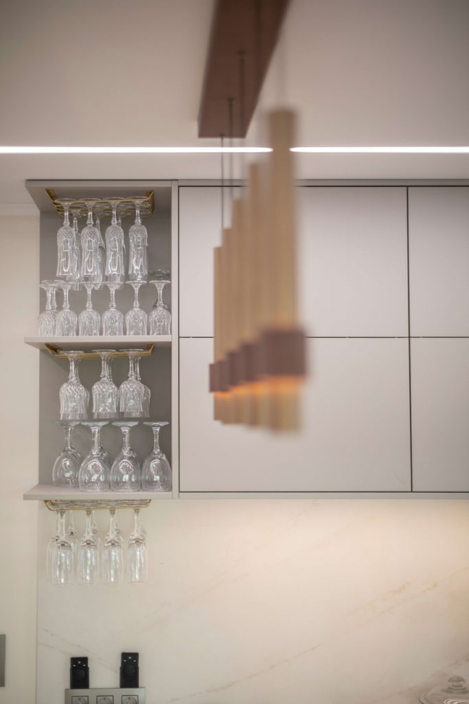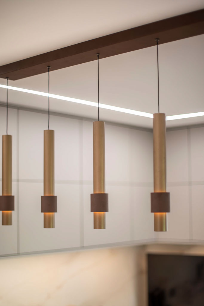 Le projet a également nécessité la création de réseaux techniques sans altérer la lisibilité des volumes, l’intégration d’un insert dans un meuble de rangement sur mesure, ainsi qu’un travail précis sur les faux-plafonds et éclairages afin de conjuguer technique et esthétique.