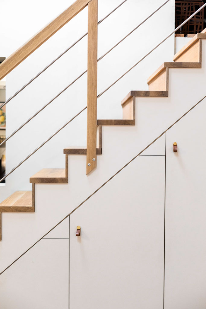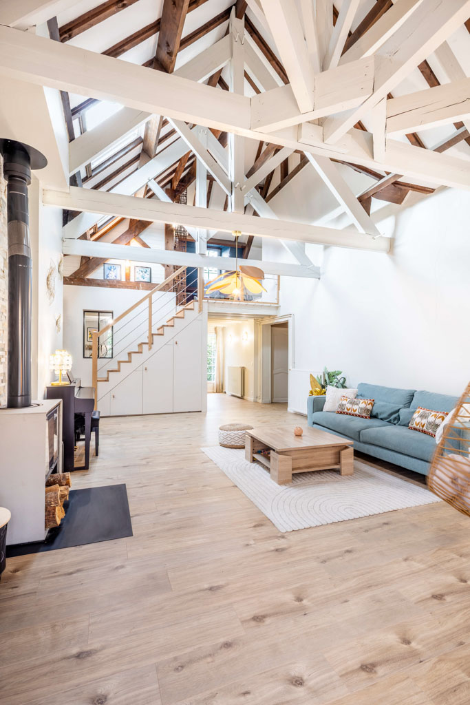 La cheminée existante a été déposée au profit d’un poêle plus adapté. Les réseaux ont été entièrement repris, la charpente allégée visuellement, et l’escalier remplacé par un ouvrage sur mesure intégrant des rangements.