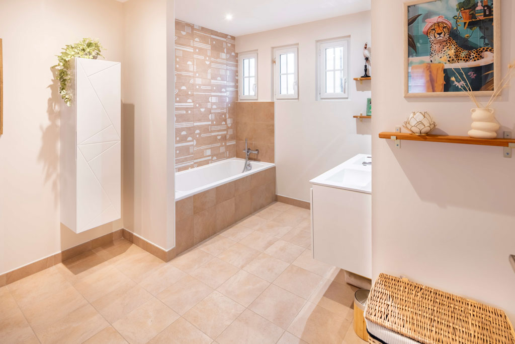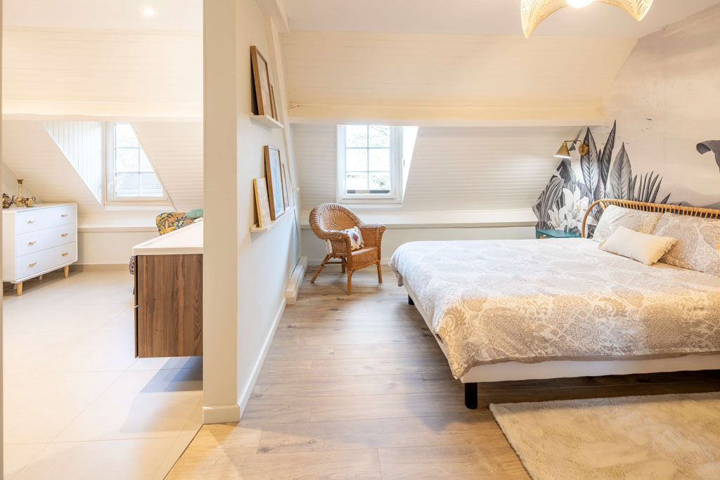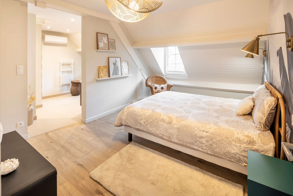 La pièce de vie est devenue un espace central fluide et convivial, la charpente s’affirme désormais comme un élément architectural valorisé. La suite parentale sous les combles offre un refuge intime et apaisant, complétant une maison pensée pour évoluer avec ses occupants.